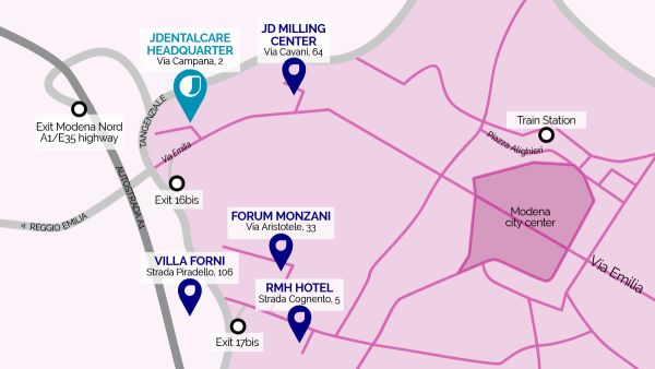 Il Forum Monzani, la sede JDentalCare, il JD Milling Center e il RMH Modena Raffaello Hotel si trovano vicino all’uscita di Modena Nord. Percorrere la tangenziale fino all'uscita 16bis per raggiungere la sede JDentalCare o l'uscita 17bis per il Forum Monzani e l'RMH Modena Raffaello Hotel.